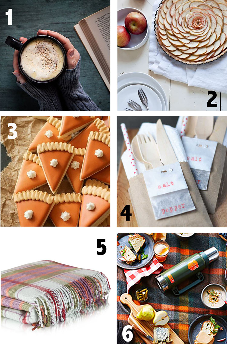 1. Cardamom & Orange Hot Chocolate / 2. Gluten Free Apple Pie / 3. Pumpkin Pie Cookies / 4. Cutlery Pocket / 5. Blanket / 6. Picnic Set up