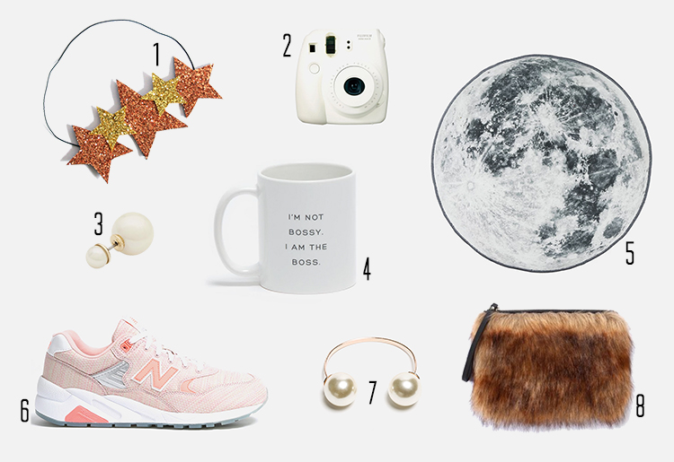 1. Star Crown / 2. Instax / 3. Pearl Earrings / 4. Bossy Mug / 5. Moon Rug / 6. New Balance Sneakers /