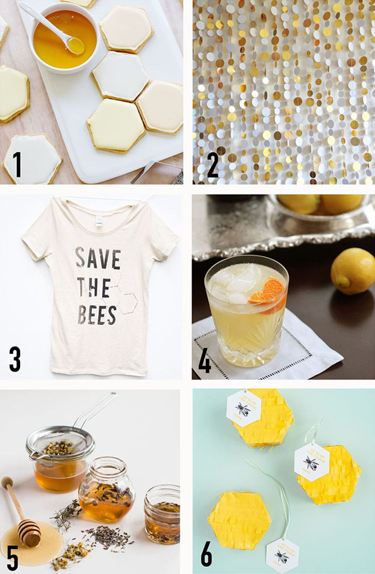 1. Honeycomb cookies / 2. Backdrop / 3. Save The Bees Tee / 4. Bees Knees Cocktail / 5. Herb Infused Honey / 6. Bee Piñata DIY