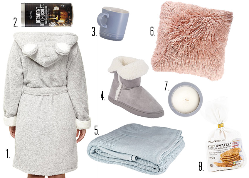 1. Hooded Gown / 2. Nomu Hot Chocolate / 3. Le Creuset Mug / 4. Sherpa Trim Slippers / 5. Cotton Blanket / 6. Faux Fur Cushion / 7. Scented Candle / 8. Stroopwafels