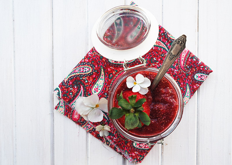 There is nothing quite like a delicious homemade strawberry jam. The mix of sweet and tart spread on some warm toast or squished into a fresh croissant. This jam is not the traditional sort, it is a really quick and easy kind that you can make with nearly any fruit in no time at all. It is free of refined sugar, doesn’t require cooking and only takes 4 ingredients, so it is basically healthy jam…I bet you didn’t think there was such a thing!