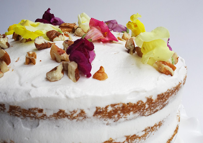 Leave your cakes to cool for about an hour in the tin before you turn them out and then leave them to cool for a further 30 minutes. While your cakes are cooling you can get going on your coconut cream frosting. Take your solid coconut cream and put it in the bowl of your stand mixer - leaving the liquid in the tin. You can then go full tilt with your whisk attachment until the cream is light and airy, slowly adding your icing sugar and then your vanilla essence. For a cream cheese kind of flavour whisk in a bit of lemon juice…and tada! Place your coconut goodness in the fridge until you are ready to ice your cakes. I did a 4 layer cake so I divided my coconut cream up and wedged it between the layers, using the rest to cover the top and sides, I then topped my cake with some edible flowers and chopped pecans. I am quite thrilled and obsessed with this cake, it is such an easy and wonderful treat to whip up for someone you love, including one’s self!